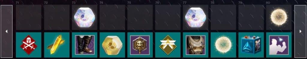 Examine the comprehensive reward progression below, featuring the standard assortment of experience buffs, cosmetic shaders, seasonal armor sets, and upgrade materials, alongside the headline Grand Overture exotic weapon.