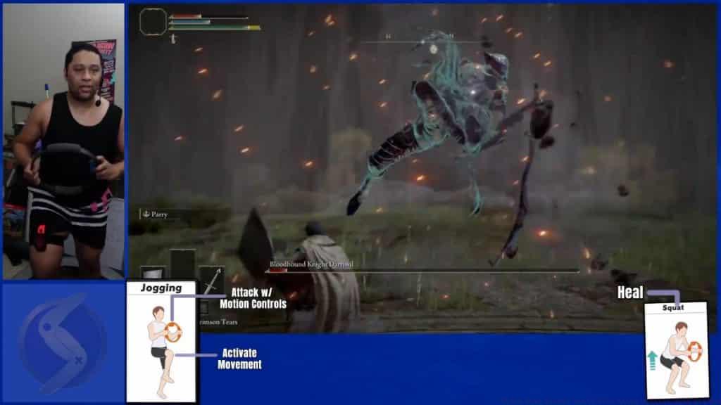 Louis brings extensive experience creating unconventional gaming methods, recently showcasing his newest innovation. Employing the Nintendo Switch fitness peripheral, he confronted the optional boss Bloodhound Knight Darriwil.This enemy presents significant challenges through unpredictable mobility and assault rhythms, making evasion particularly demanding. Undaunted, Louis confidently entered combat equipped with his modified fitness controller.Maintaining continuous stationary jogging, the streamer expertly maneuvered around the boss. He systematically delivered precisely timed strikes and evasion techniques, culminating in a successful elimination.“The healing mechanic presents both fascinating complexity and frustration,” Louis detailed. “Standard healing inputs prove ineffective, but incorporating squats—mirroring Ring Fit Adventure mechanics—activates health restoration.Louis not only simplified the encounter visually, but achieved victory during his initial attempt. This engaging challenge represents both entertainment and effective calorie-burning exercise.