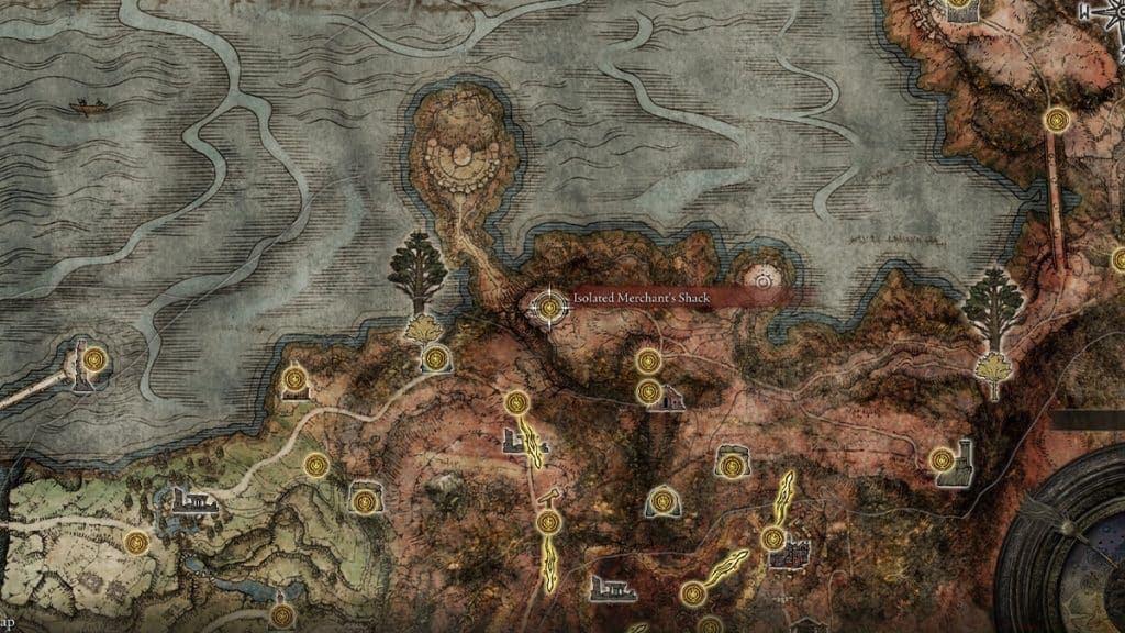 Strategic positioning of the Isolated Merchant’s Shack in Caelid. Consider exploring additional merchant offerings while visiting, as they stock other valuable early-game items.