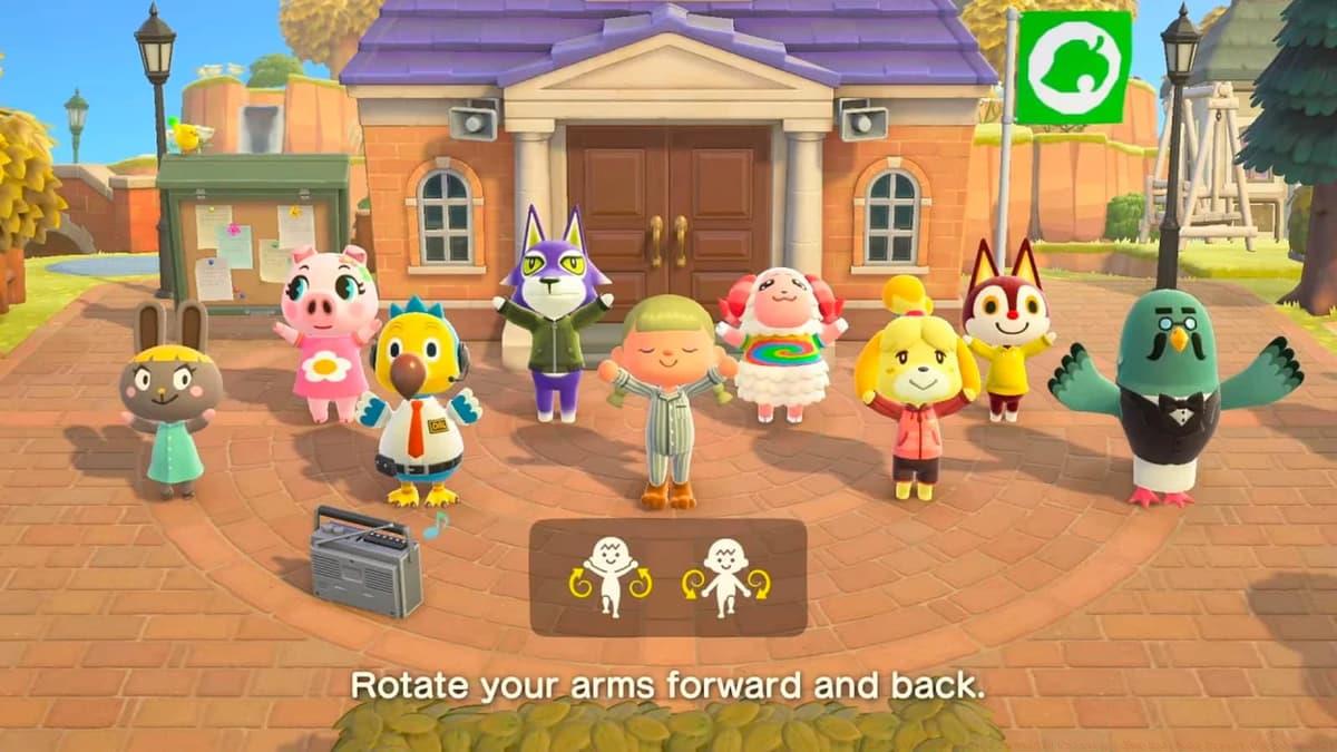 The exercise utilizes Joy-Con motion controls to encourage real-life stretching. Expert advice: Consistent participation increases villager friendship levels and occasionally yields special reactions.