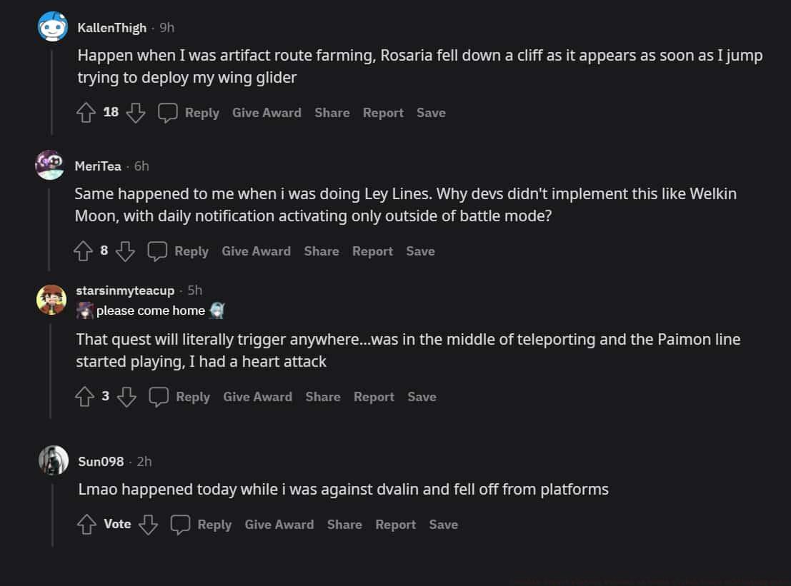 Further investigation revealed the bug’s scope extends far beyond the Abyss. Players reported fatalities during routine open-world activities. One account described artifact farming gone wrong: “Rosaria fell down a cliff as the notification appeared as soon as I jumped and was trying to deploy my glider.” The bug also plagues major boss encounters, with users stating, “Happened while I was fighting Dvalin, causing me to fall off the platforms,” and “Paimon started talking and Maguu Kenki sent poor Rosaria to heaven.”