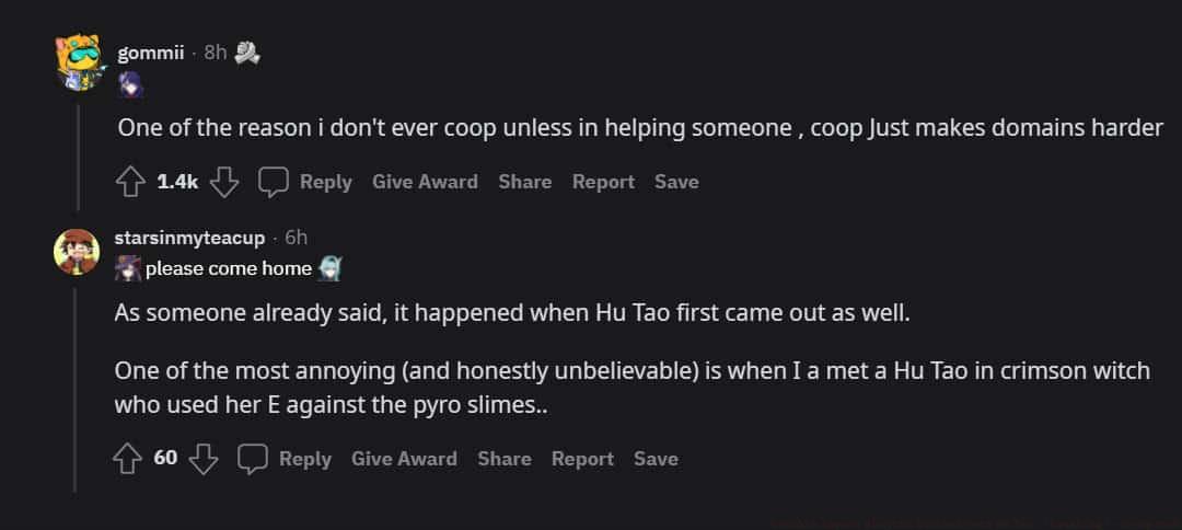 https://www.reddit.com/r/Genshin_Impact/comments/qn79tx/anyone_come_across_this_in_coop_since_hutao/ This player’s negative experience was far from isolated, as numerous community members shared similar encounters in cooperative mode following Hu Tao’s banner recurrence in Update 2.2. “This situation represents one of the primary reasons I avoid cooperative play unless assisting friends. It simply makes domain clears more challenging,” one participant commented. “Similar issues occurred during Hu Tao’s original release. The most frustrating instance I encountered involved a Hu Tao user in Crimson Witch domain who persistently used her elemental skill against Pyro Slimes,” another community member added.