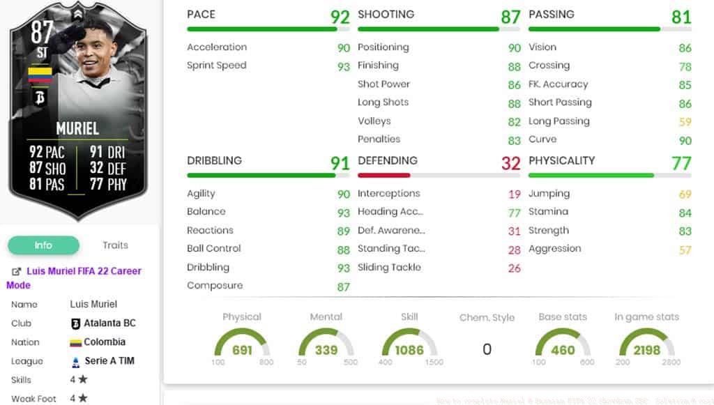 Muriel’s Showdown card represents the archetypal meta striker that dominates FIFA 22’s competitive scene. In a gameplay environment dominated by pace and dribbling, Luis Muriel’s attributes align perfectly with winning strategies. His acceleration and sprint speed can reach 99 with Hunter chemistry style, while his 90 dribbling with 4-star skill moves creates separation opportunities against even the most organized defenses.
