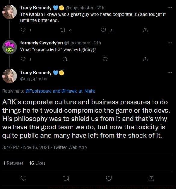 During the ongoing Activision Blizzard controversies in mid-November, Kennedy praised Kaplan’s determination to protect developers from corporate interference through her Twitter thread. “The Kaplan I knew strongly opposed corporate bureaucracy and consistently challenged it,” Tracy explained, “His approach was to buffer the team from these distractions, which helped maintain our strong team dynamic, though now the toxic elements have become public knowledge and many team members have departed due to the revelations.”