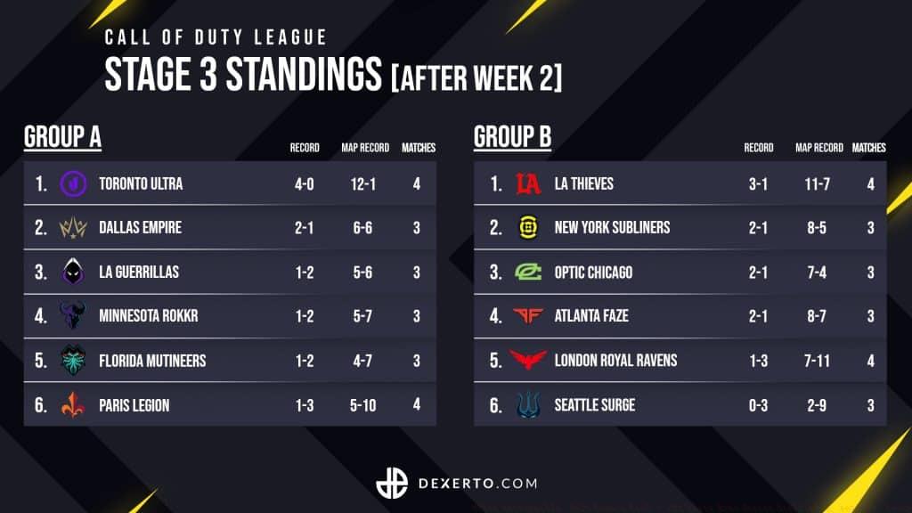 DexertoUpdated CDL Stage 3 Group Standings showing Ultra’s dominance and Group B’s tight race.