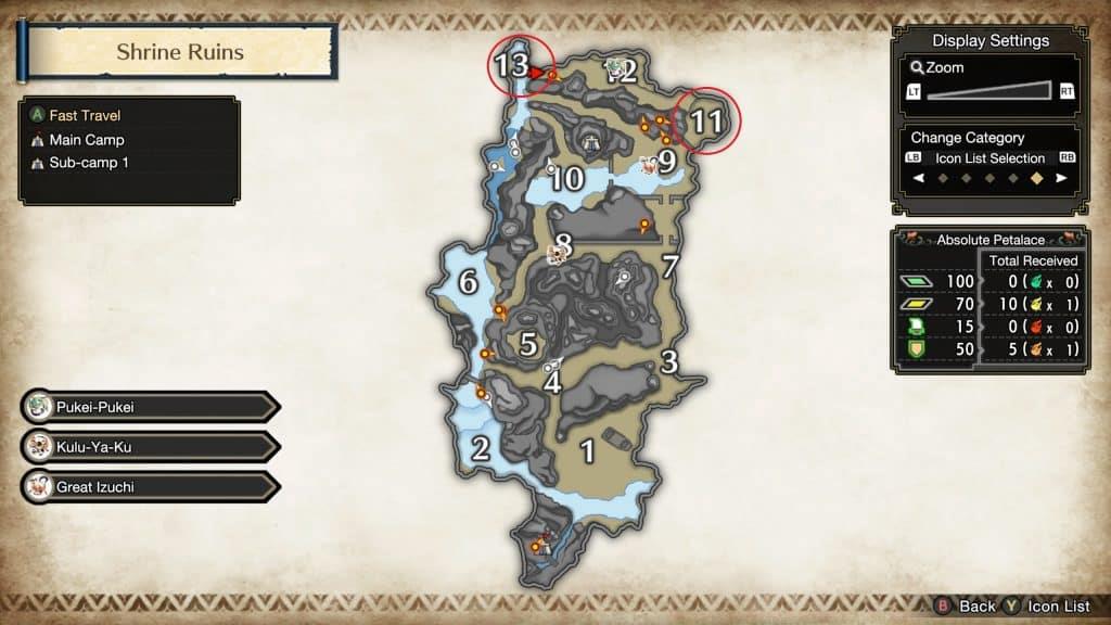 Route Planning: In Shrine Ruins, start in Base Camp, fast-travel to Sub-camp 1 (near zone 11), clear the Kelbi, then run or wirebug to zone 13. After clearing zone 13, open your map and fast-travel back to Base Camp or Sub-camp 1—this often triggers a partial respawn. Repeat this loop.