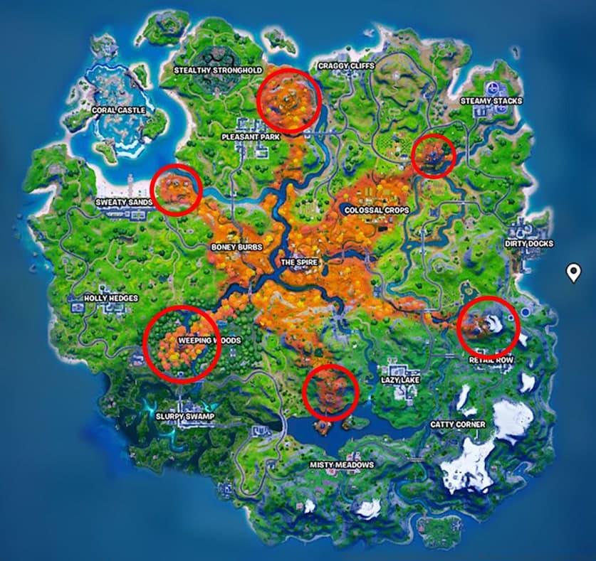 Epic GamesGuardians patrol seven distinct Spire locations: The Spire, Colossal Crops, Boney Burbs, Spire locations near Weeping Woods, Coral Castle, and two additional towers in the central island region. Each offers unique terrain advantages:
