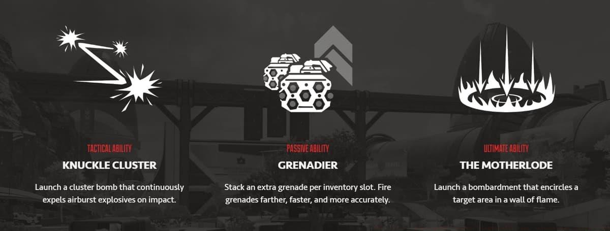 - Passive: Grenadier – Fuse’s mechanical arm provides unparalleled grenade control. He can: