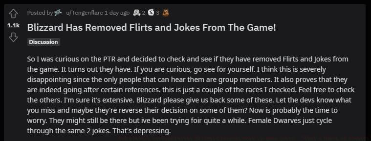 The community developed several tactical responses beyond mere complaint. Players began systematically cataloging removed voice lines by race and gender, creating comprehensive documentation to demonstrate the changes’ scope. Others compiled examples of genuinely problematic content that remained untouched, constructing comparative arguments about Blizzard’s priorities. Common pitfall: Focusing exclusively on emotional outrage rather than building evidence-based cases that developers can practically address. Optimization approach: Use in-game recording tools or third-party software to create archival footage of content before removal, preserving it for comparative analysis and historical reference.